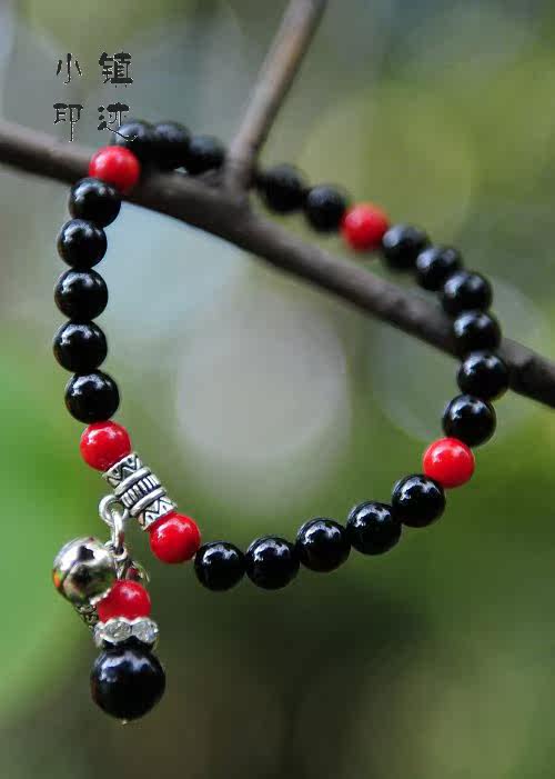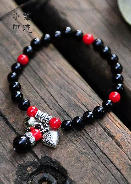 Materials: black onyx, red coral beads, Tibetan silver, elastic cord