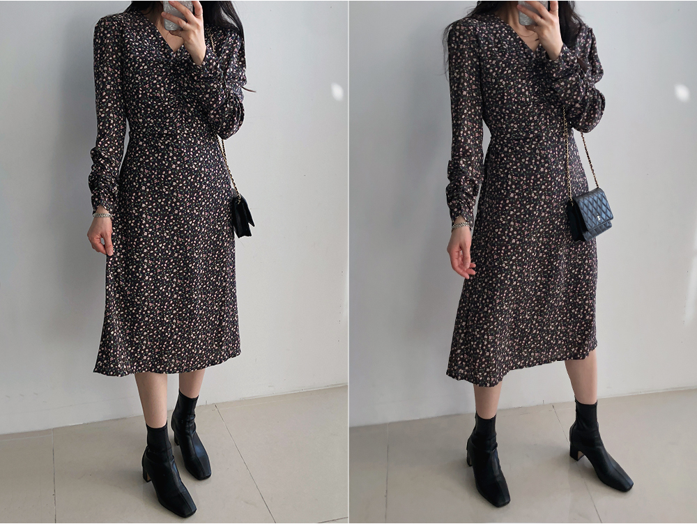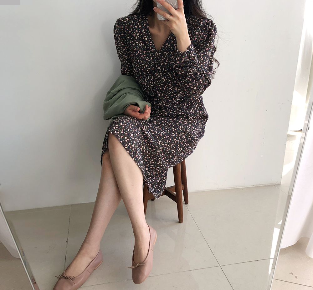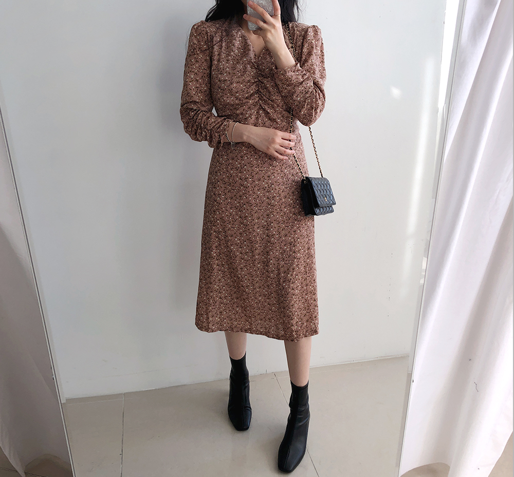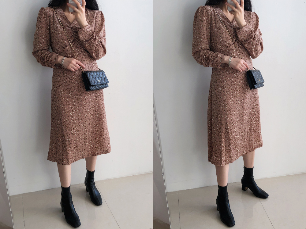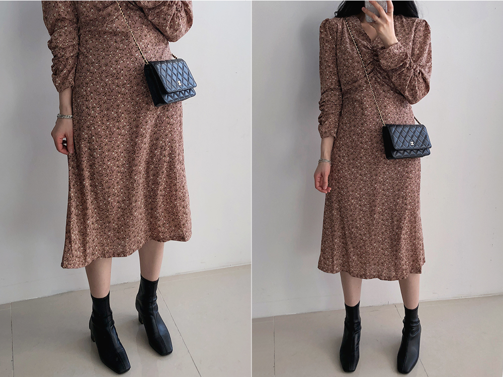 셔링 플라워 브이 넥 롱 원피스
