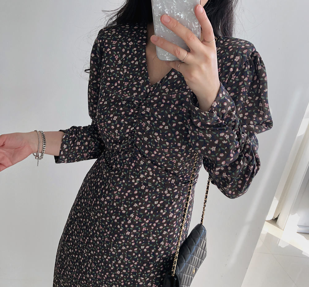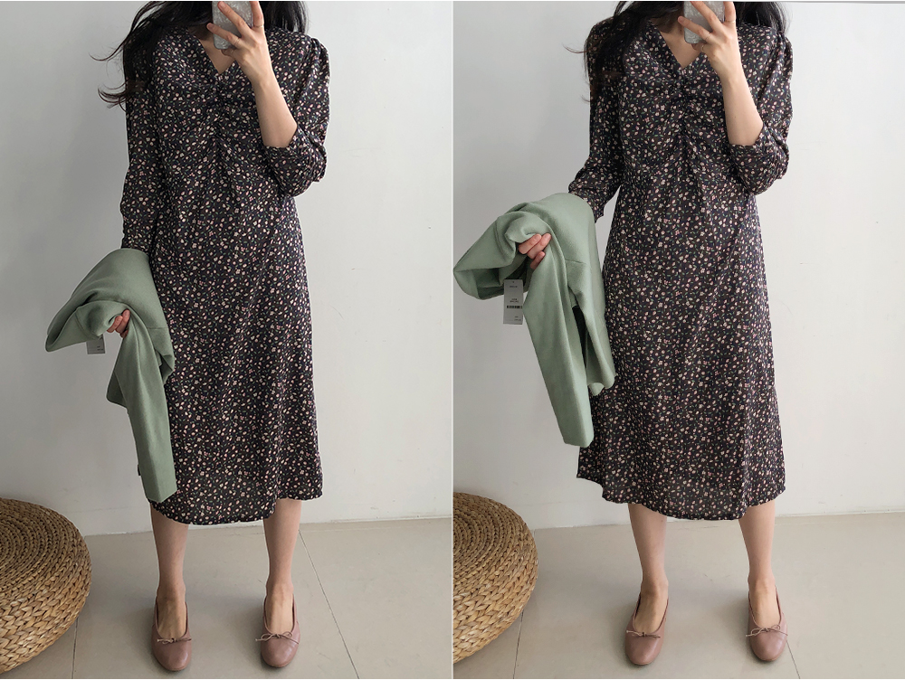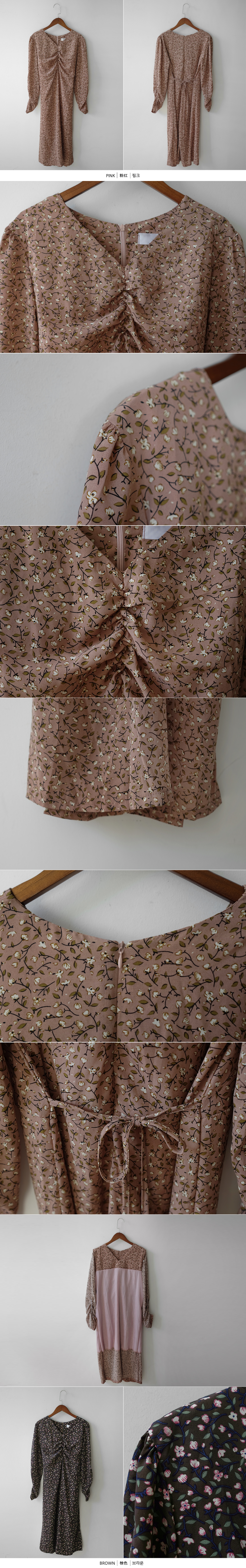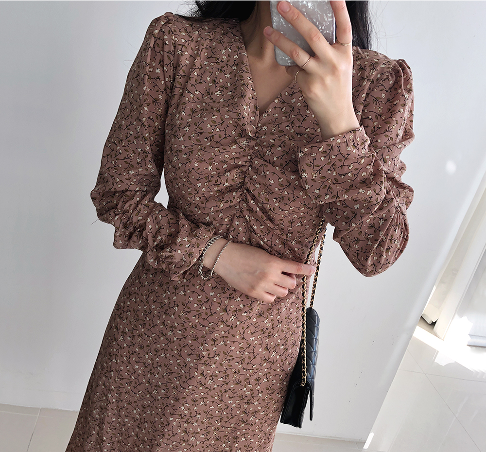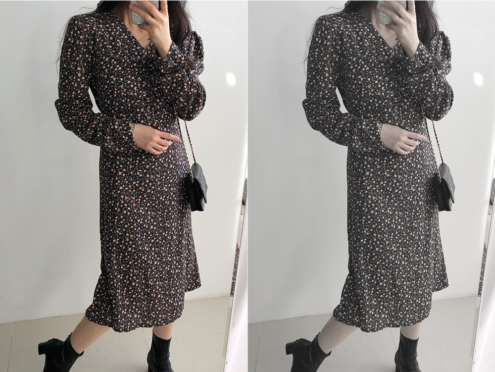 셔링 플라워 브이 넥 롱 원피스