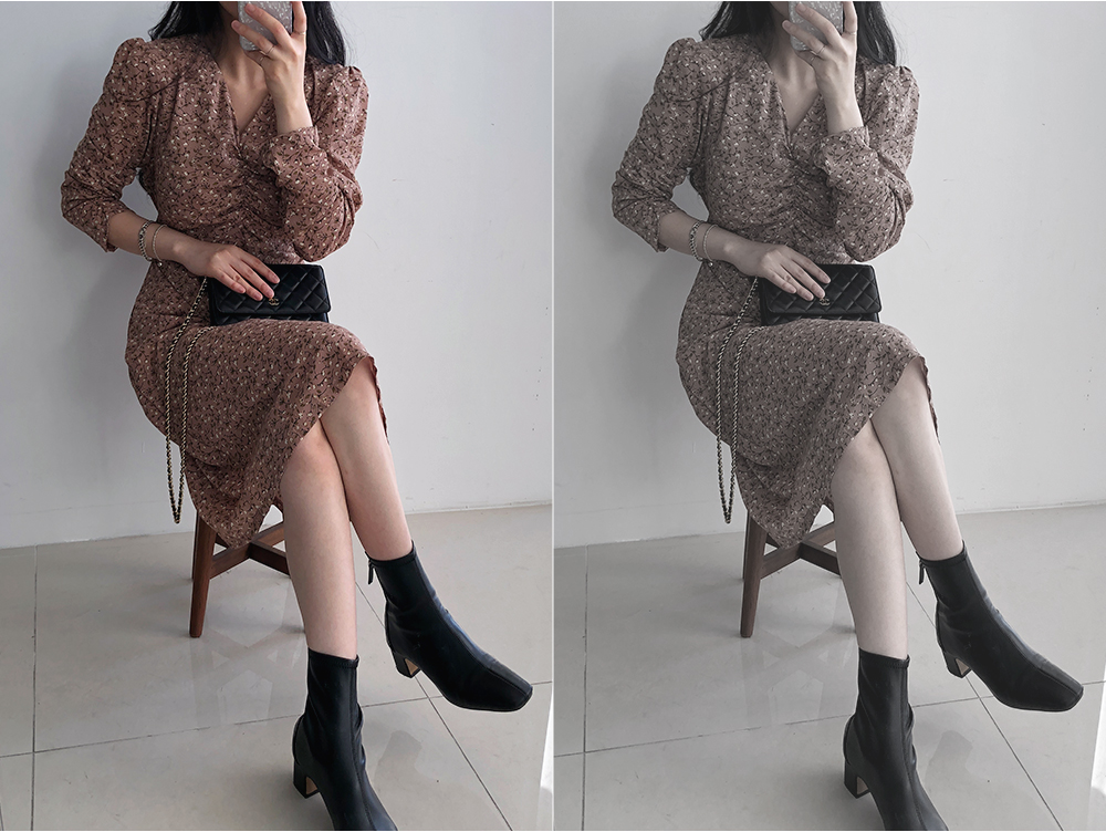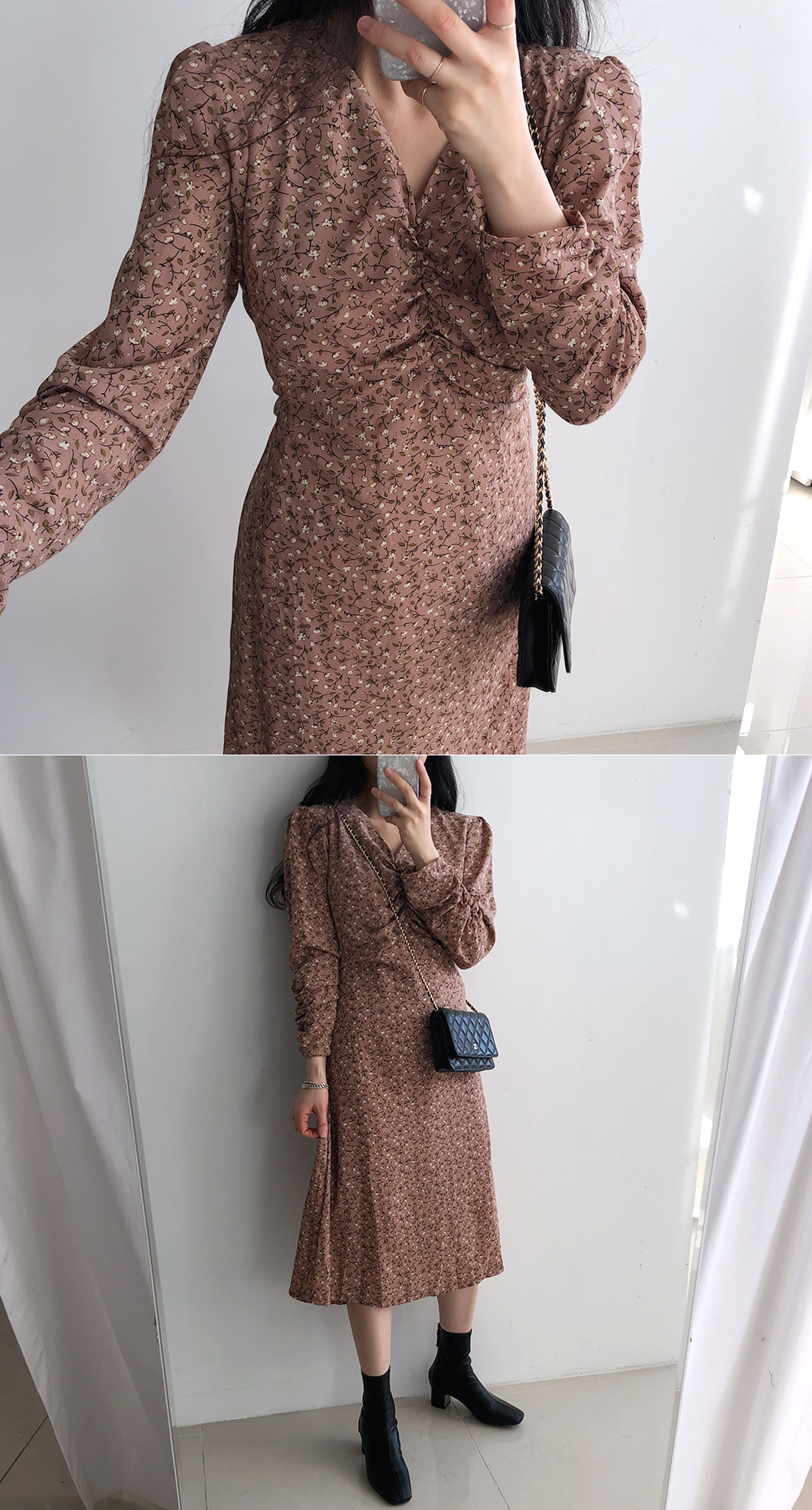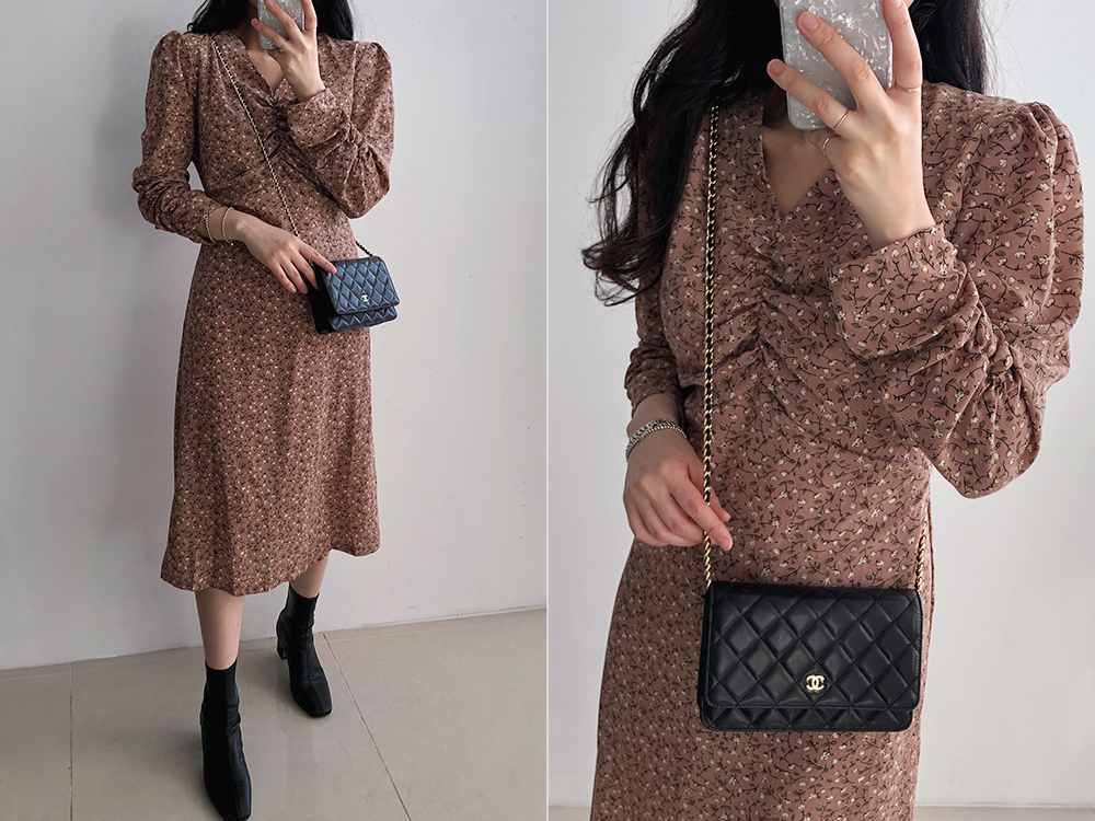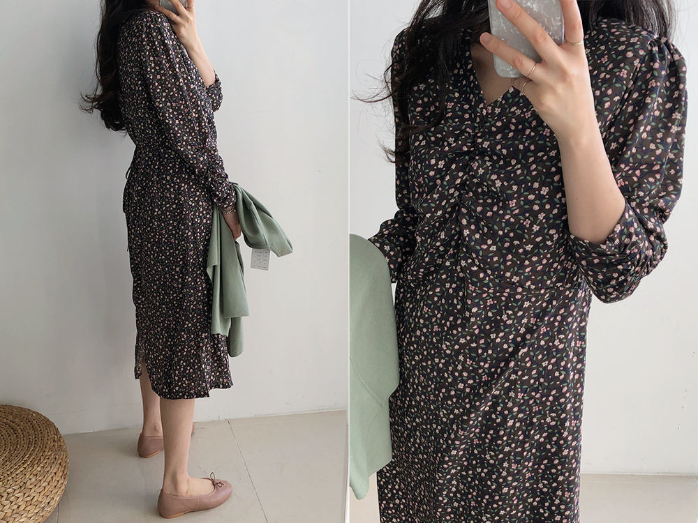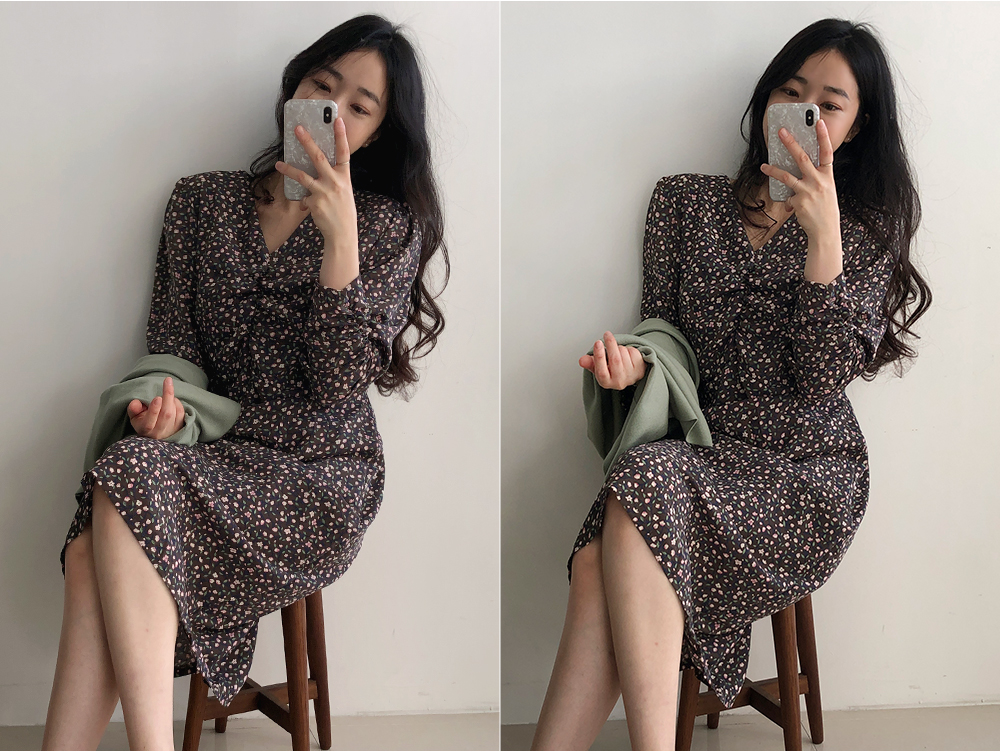 셔링 플라워 브이 넥 롱 원피스