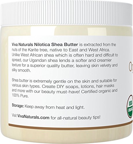 Feature : Certified Organic Grade A Shea - White shea butters are stripped from their natural color and nutty aroma, destroying nutrients and antioxidants. Our shea butter is raw, unrefined and ivory- the way any high quality shea butter should be. / Softer, Creamier Texture - Most shea butters are in block form, making them difficult to spread and apply to skin. Our Ugandan shea has a higher oleic content, lending a silky smooth consistency for everyday hair and skin care. / DIY Soaps and Lotions - Shea butter is so versatile it can be used in any homemade beauty recipe. Fill soap moulds with shea butter, Viva essential oils and coconut oil as natural skin food. / Nourishing Body Butter - Apply shea butter after showering to keep skin plump, supple and youthful. Nutrients like vitamins A, E and essential fatty acids found in shea soothe dry rough patches. Can be used as an everyday moisturizer too! / Stretch Mark Rescue - As a hydrating emollient, shea butter is an inexpensive alternative to lotions and ointments. Apply to affected areas to help fade the look of stretch marks and replace lost fatty acids.
