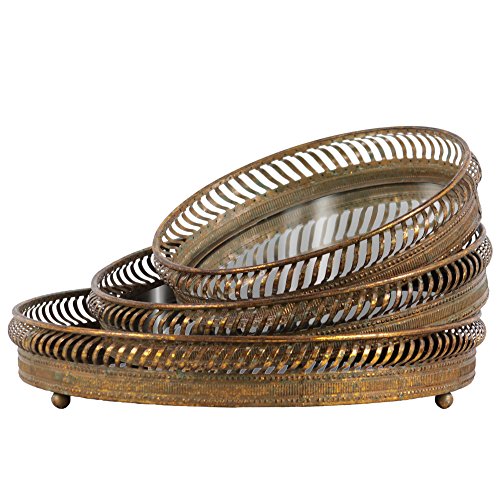 Benzara Tarnished Round Mirror Tray Pierced Metal Side Set of 3 Gold
