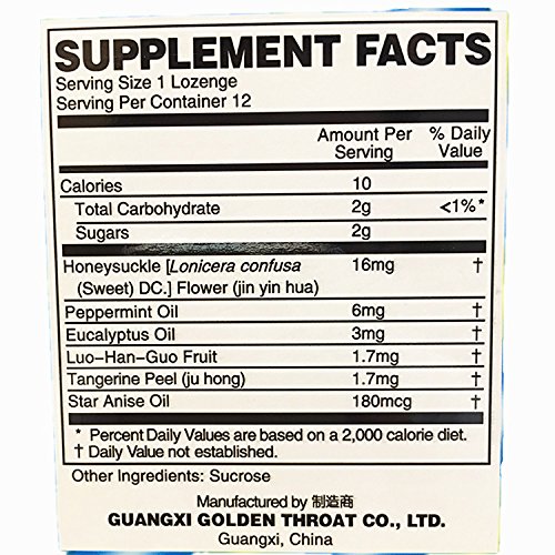 Studio : Golden Throat Publisher : Golden Throat Binding : Health and Beauty Product Description The Honeysuckle Soothing Drop (Golden Throat Lozenge) is researched by the renowned biologist-professor Wang Yao-Fa. The unique product is manufactured by the company especially for throat protection. The formula is distinctive with the accumulated experience of traditional Chinese medical science and cytology theory, specially produced by the essence of Watermelon Frost, Luohan Fruits, Eucalyptus Oil, Menthol Crystals and numerous other traditional Chinese medicine. With efficacy like clearer voice, throat protection, bad breath elimination etc. Totally poison-less and without side effect. 0
