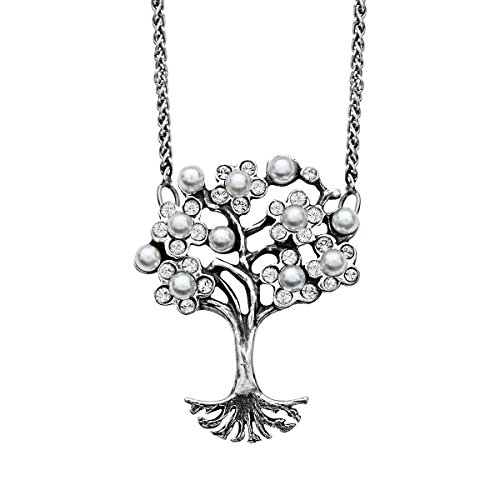 Van Kempen strikes a harmonious balance between Art Nouveau splendor and refined craftsmanship. This necklace features a charming tree of love crafted in sterling silver with blooms of luminous simulated shell pearls and twinkling Swarovski crystals. Piece measures 1 1/4 inches by 7/8 inches with a total length of 15 3/4 inches. Pearls have been bleached to enhance their appearance.Feature