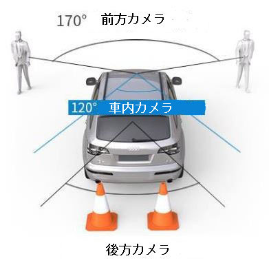●フロントカメラ:広角約170度/1080P・車内カメラ:広角約120度/VGA・バックカメラ:VGA(5m以上)