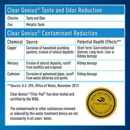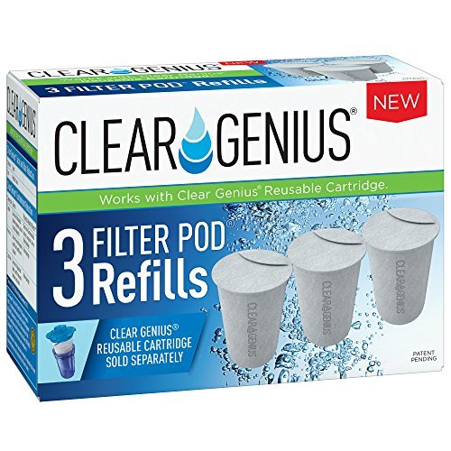 WHY CLEAR GENIUS? Clear Genius is a reusable water filtration system that fits Brita, Clear Genius and Pur water pitchers. Clear Genius reusable cartridges drastically reduce the waste created by discarding disposable plastic filters. Clear Genius provides those who currently use Brita, Clear Genius and Pur water pitchers a better way to filter water, allowing you to achieve a more environmentally conscious and cost effective result. HOW IT WORKS. Clear Genius water filtration system turns tap water into healthy, great tasting drinking water. Tap water is filtered through a blend of activated carbon and ion exchange resin, all contained within a non-woven, shell which also serves as a filtration element, to prevent black flecks. One Clear Genius Filter Pod Refill: Reduces harmful contaminants without removing minerals your body needs, filters 40 gallons of water - the equivalent of 300 (16.9 oz.) containers of bottled water, provides a more eco-friendly way to enjoy great tasting water, and reduces environmental waste by removing the need to discard approximately 6-12 plastic filter cartridges per year (based upon average household daily consumption of 0.5 gallons per person) as is typically the case with other leading brands.Feature