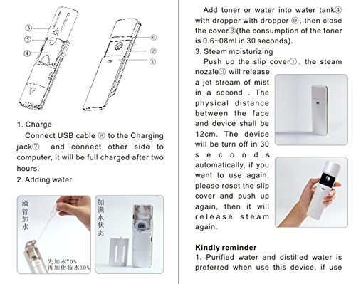 5)Comprehensive Moisturizing: It can be used for care of face, body and hair. Prevent hair static, reduce wrinkles of skin, whitening skin and relieve skin irritation. Only 60 seconds using Nano Steamer can achieve sustainable moisture replenishment of 24 hours..USB Rechargeable.(Built-in Lithium battery).You also can connect a power plug.
