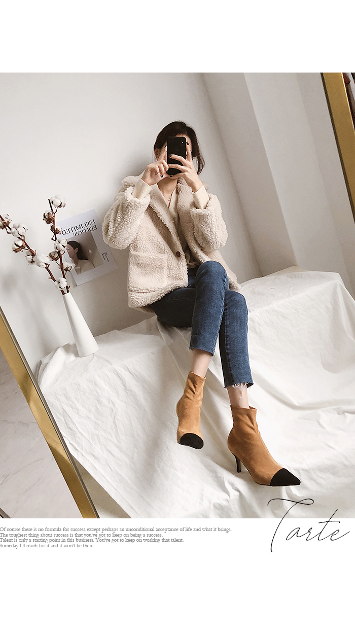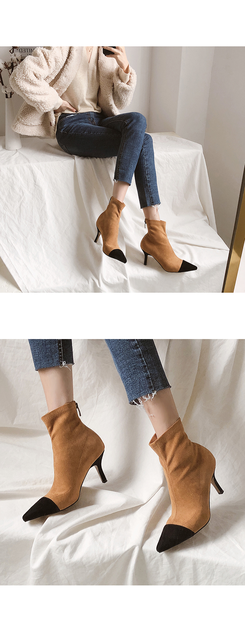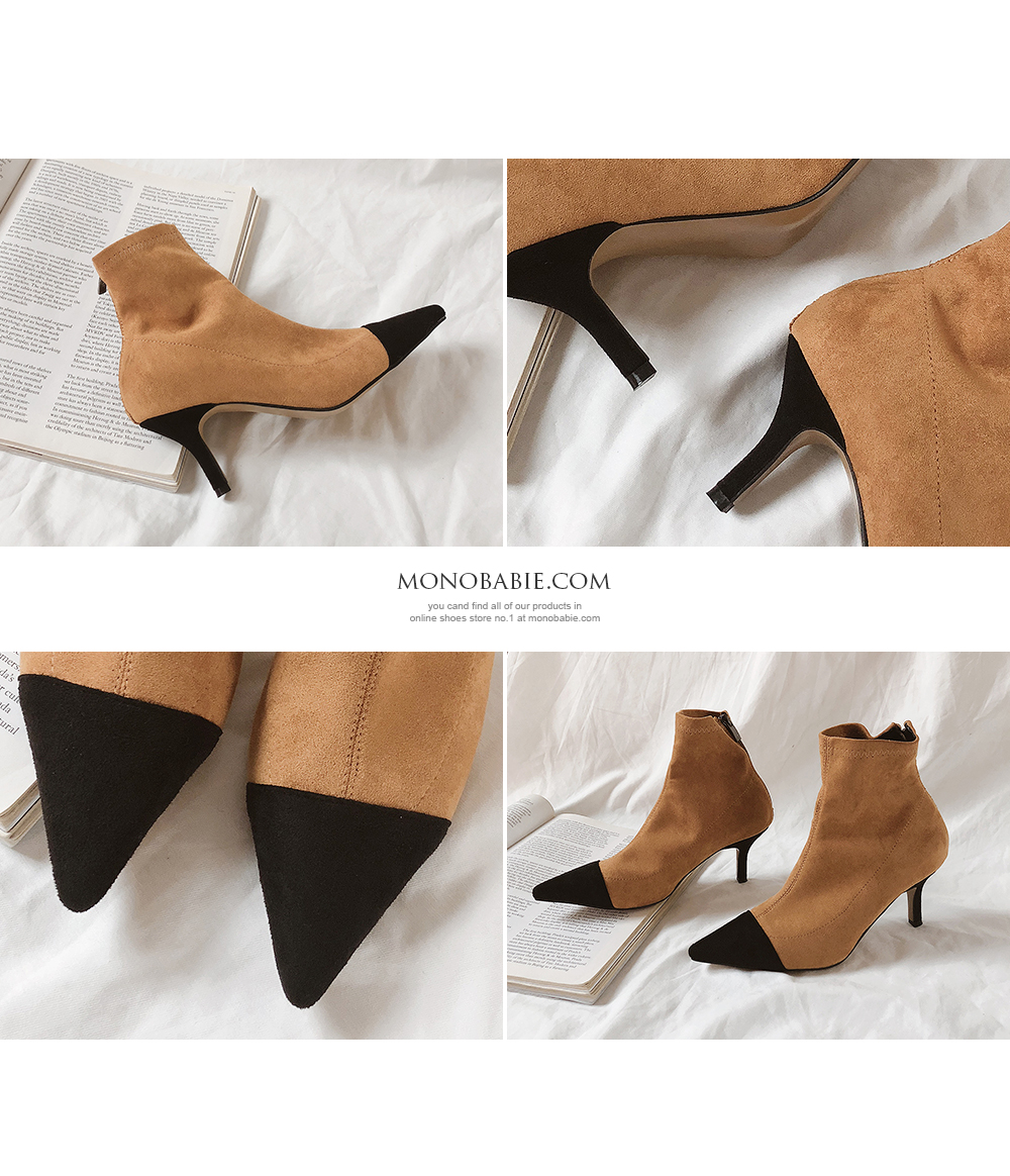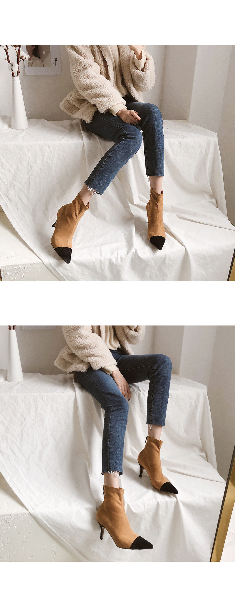 스틸레토 쉐입이 섹시미와 여성미를 동시에 연출시켜주는 앵클부츠입니다.