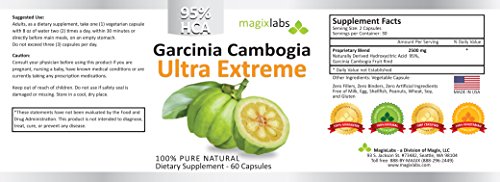 -. Binding : Health and Beauty -. Brand : MagixLabs -. EAN : 0804551196911 -. Feature : 95% HCA by MagixLabs® - 3rd party certified. 100% Amazon Money Back Guarantee! / Exclusive patent pending process producing ultra refined + maximum concentrated pure HCA extract for the highest potency supplement product (95% HCA + 2500mg per serving) almost double that of most other products / A pleasure to take: Only 1 capsule twice a day - Can be taken WITH your meal. / Made in the USA using only the highest quality ALL NATURAL ingredients following strict GMP (Good Manufacturing Practices) in a FDA registered facility. / Since only HCA burns fat and suppresses appetite + weight loss results are dosage dependent, you owe it to yourself to get the highest net HCA product. This defines 95% HCA Garcinia Cambogia by MagixLabs®. Consider ordering 2 or more bottles for uninterupted use. -. IsAdultProduct : 0 -. Label : MagixLabs -. LegalDisclaimer : These statements have not been evaluated by the FDA. This product is not intended to diagnose, treat, cure, or prevent any disease. -. Manufacturer : MagixLabs -. PackageQuantity : 1 -. ProductGroup : Health and Beauty -. ProductTypeName : HEALTH_PERSONAL_CARE -. Publisher : MagixLabs -. Studio : MagixLabs -. Title : MagixLabs Garcinia Cambogia Ultra Extreme Weight Loss Supplement - 60 Capsules -. UPC : 804551196911