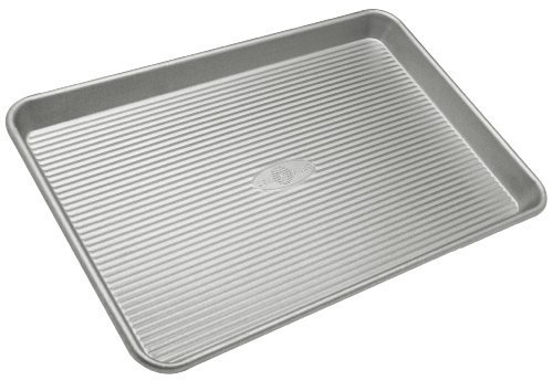 Studio : USA Pan Publisher : USA Pan Product Description Made in the USA Aluminized Steel Jelly Roll Pan, commercial grade and heavy gauge- measures 14.25 x 9.38 x 1 inches;Unique corrugated surface design facilitates air circulation for evenly baked goods and quick release;Coated with Americoat - a silicone that is PTFE, PFOA and BPA free;65% recycled steel and life-time warranty;USA Pan is a Bundy Family Company that has proudly manufactured high quality bakeware and provided jobs in the USA for over 50 years 0
