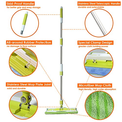 Firm Structure and Durable Quality - Sturdy and durable stainless steel telescoping handle. Machine washable microfiber mop cloths for both wet and dry use.