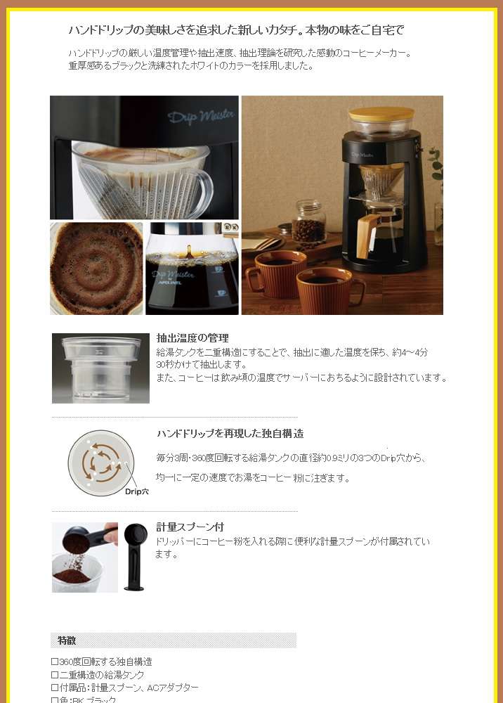 ●今までのコーヒーメーカーになかった360度回転という独自構造アイデアを採用してコーヒー豆の持つ奥深い味わいを引き出す事に成功しました