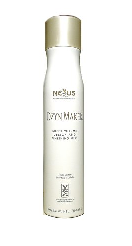 -. Binding : Health and Beauty -. Brand : Nexxus -. EAN : 0605592340536 -. Feature : Dzyn Maker is the lastest generation aerosol with many versatile performance features / Ultimate lightweight working spray for creating natural styles without stiffness or stickiness / Unique ingredients adds noticeable volume and brilliant lustre to all hair types / Body building formula is soft to the touch with a hold that bounces back after brushing or combing -. IsAdultProduct : 0 -. IsAutographed : 0 -. IsMemorabilia : 0 -. Label : Nexxus -. Manufacturer : Nexxus -. Model : 600450 -. MPN : 154760 -. NumberOfItems : 1 -. PackageQuantity : 1 -. PartNumber : 154760 -. ProductGroup : Beauty -. ProductTypeName : BEAUTY -. Publisher : Nexxus -. ReleaseDate : 2004-01-05 -. Studio : Nexxus -. Title : Nexxus Dzyn Maker Design and Finishing Mist 14.1 Ounces -. UPC : 605592340536