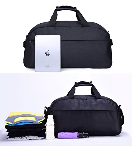 -. Feature : Super Lightweight Duffel ---- MIER gym bag is made of high grade & deluxe fabric, which is lightweight (1.65lb) but tough and durable; Quality brand zip "SBS" be used for extra smooth and robust / Multifunctional Pockets ---- 1 roomy main compartment with two-way zipper closure, 1 inner zippered pouch storing for valuables, 2 inner open pockets with velcro fastened, 2 external side open pockets, 1 front useful and quite spacious compartment with zipper closure / Spacious Sports Duffel ---- Main compartment size is 24.8"*9.8"*12.6", plenty of place to fit you need inside with ease, large enough for short trip travel, workout, camping, hiking, indoor/outdoor activities, a week away and etc / Variety of Carry Options ---- Adjustable/Detachable padded shoulder strap can adjust from 35"-57"; A couple carry handles with leather wrapped top for easy grip and lifting; 2 side haul handle for easy carrying / Special Design ---- Bottom and two side padded thick, soft and strong foam, protect your stuff from dirt and wet. Shell material is easily wiped down and therefore not stain. Solid stitching reinforcement on all stress points