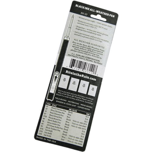 -. Binding : Misc. -. Brand : Rite In The Rain -. Color : Black -. Feature : Size - 5 1/4" long / Weight - 0.05 lb. EA / Write in any position / Black Ink Fine Point / Manufactured By Fisher Space Pen Exclusively for J.L. Darling -. Label : Rite In The Rain -. Manufacturer : Rite In The Rain -. MPN : 360035 -. PartNumber : 360035 -. ProductGroup : Sports -. ProductTypeName : SPORTING_GOODS -. Publisher : Rite In The Rain -. Studio : Rite In The Rain -. Title : Rite in the Rain All Weather Pen no. 37 Black Ink