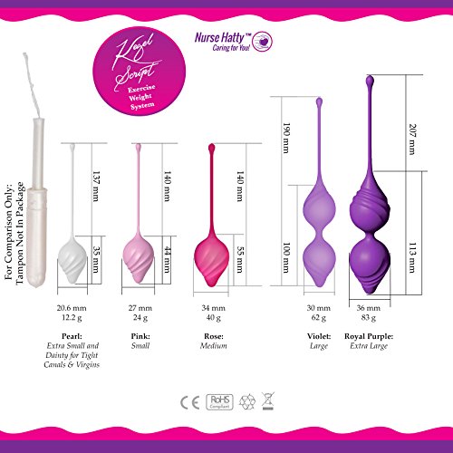 ✅ SMART Next Generation PREMIUM KEGEL EXERCISE WEIGHT SYSTEM by Nurse Hatty: The individual size of every woman has inspired me to Design a Kegel exercise system tailored to you & your goals! With extensive R&D my professional team has perfected an Intricate & Comfortable TRIPLE SAFETY DESIGN of my 5 Progressive Weight System along with the best all-around 7-STEP TRAINING GUIDE Professionally Translated in 7 Languages: Chinese, English, French, German, Italian, Spanish & Vietnamese.