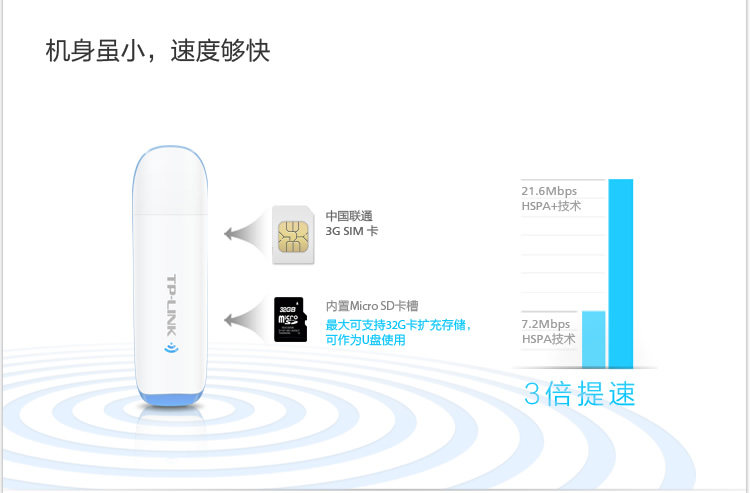 The standard 3G TL-TR861 Mini support Chinese Unicom systems (U) SIM data card only the TL-TR861 Mini into the laptop and other equipment, USB port you can easily access 3G network. TL-TR861 Mini supports HSPA+maximum downlink speed can reach 21.6Mbps compared to China Unicom ongeneration of 7.2Mbps HSPA downlink rate increased 3 times.