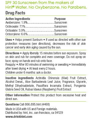 BROAD SPECTRUM PROTECTION: Hint Sunscreen combines the subtle hint of fruit that flavors Hint's delicious waters and adds it to a broad-spectrum SPF 30 formula to provide your skin with a mist of sun protection that's easy to apply and water resistant.
