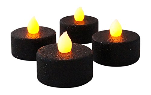 -. Feature : Black glitter LED tea lights will add the perfect touch to your Halloween or everyday decor. / Ideal for using inside candleholders or other lighted decorations, but the black glitter look means they also look great on their own. / Buy several sets to make a large display or centerpiece for your table. / Batteries included, turn on and off easily with switch. Flames are flickering orange.