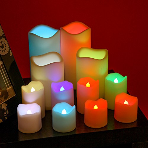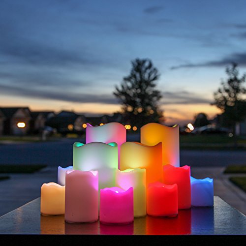 12 Ivory Resin Flameless Candles, Amber and Color Changing LEDs, Assorted Sizes, Indoor/Outdoor Use, Batteries Included