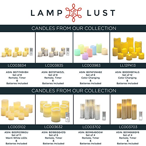 Battery: Include 2 AA batteries per pillar candle and 1 CR2450 per votive and tea light.