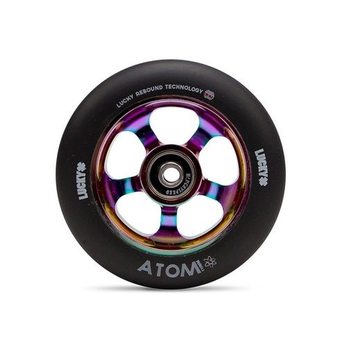 Studio : Lucky Publisher : Lucky Product Description Lucky Atom Wheels are 110mm scooter wheels. Scooter wheels come in a variety of sizes, ranging from 100mm to 125mm. The larger the wheel, the faster it is. 100mm wheels are typically entry level wheels while 125mm are geared towards the pros who need speed for big air tricks. Atom Wheels are compatible with forks and decks that fit 110mm wheels. Scooter wheels not only come in a variety of sizes but also hardness. 86a polyurethane hardness, or durometer, indicates a softer wheel that will provide more grip than an 88a durometer wheel, which has a harder polyurethane that lends to durability and speed. Softer scooter wheels are typically better for park riding, while harder wheels are geared more towards street riding. 0