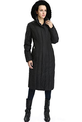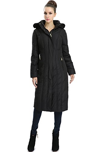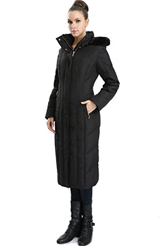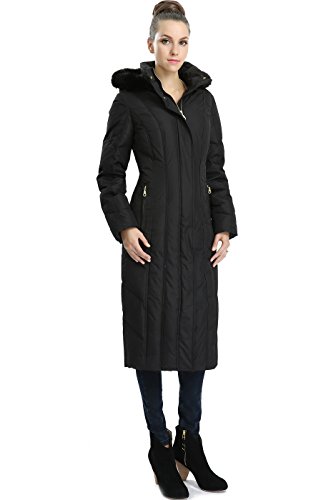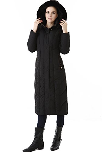 A modern quilted design and tapered waist add flattering definition to a full length hooded puffer down coat detailed with a rib-knit inner cuffs for additional warmth.
