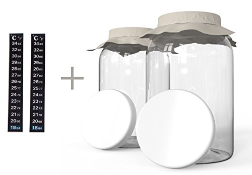 KombuJars Kombucha Jar 1 Gallon Glass (2 Pack) Brewing Fermenting Storage Bottle, With Plastic Lid, Thermometer Adhesive Strip, Cloth Cover, and Band