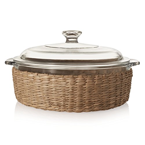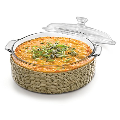 - Straw basket insulates dish and provides a built-in trivet (basket is not oven or dishwasher safe)