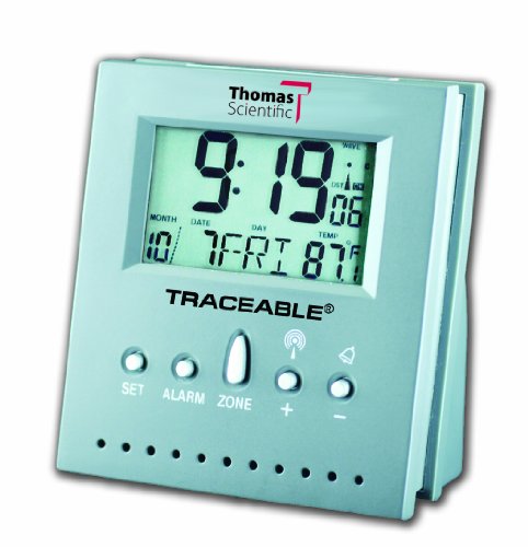 Studio : Thomas Publisher : Thomas Binding : Misc. Product Description Traceable adio controlled atomic clock is accurate to 1/10,000 of a second. Resolution is 1 second. Receives a radio signal directly from the National Institute of Standards and Technology atomic clock (accurate to one hundred billionth of a second) in Boulder, Colorado. Ideal for recording the receiving of samples, noting the exact time an event occurred, supporting documentation, providing a standard for a location’s other clocks, maintaining ISO 9000 certification, and for the myriad of occasions when knowing the exact time is immensely valuable. Radio signal automatically adjusts for AM/PM, 24-hour time, day/date, daylight savings time, leap year, and leap seconds (earth rotation wobble corrections). To assure accuracy an individually serial-numbered Traceable certificate is provided from our ISO 17025 calibration laboratory accredited by A2LA. It indicates traceability to standards provided by NIST (National Institute of Standards and Technology). Backlighting permits viewing in total darkness. Alarm volume increases until turned off. Temperature range is from 32 to 158 degree F and 0 to 50 degree C with a resolution 0.1 degree and an accuracy of /-1 degree C. LCD digits, 1/2" high, are readable from over 10 feet. Battery operation (one AA supplied) eliminates electrical outage concerns and runs continuously for 1 year. Measures 2.5" width by 3" height by 1.5" thick. Weight is 4 ounces. 0