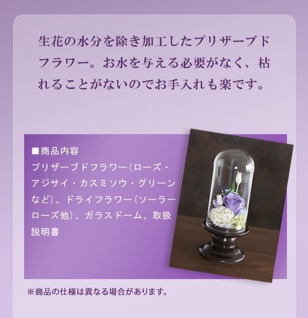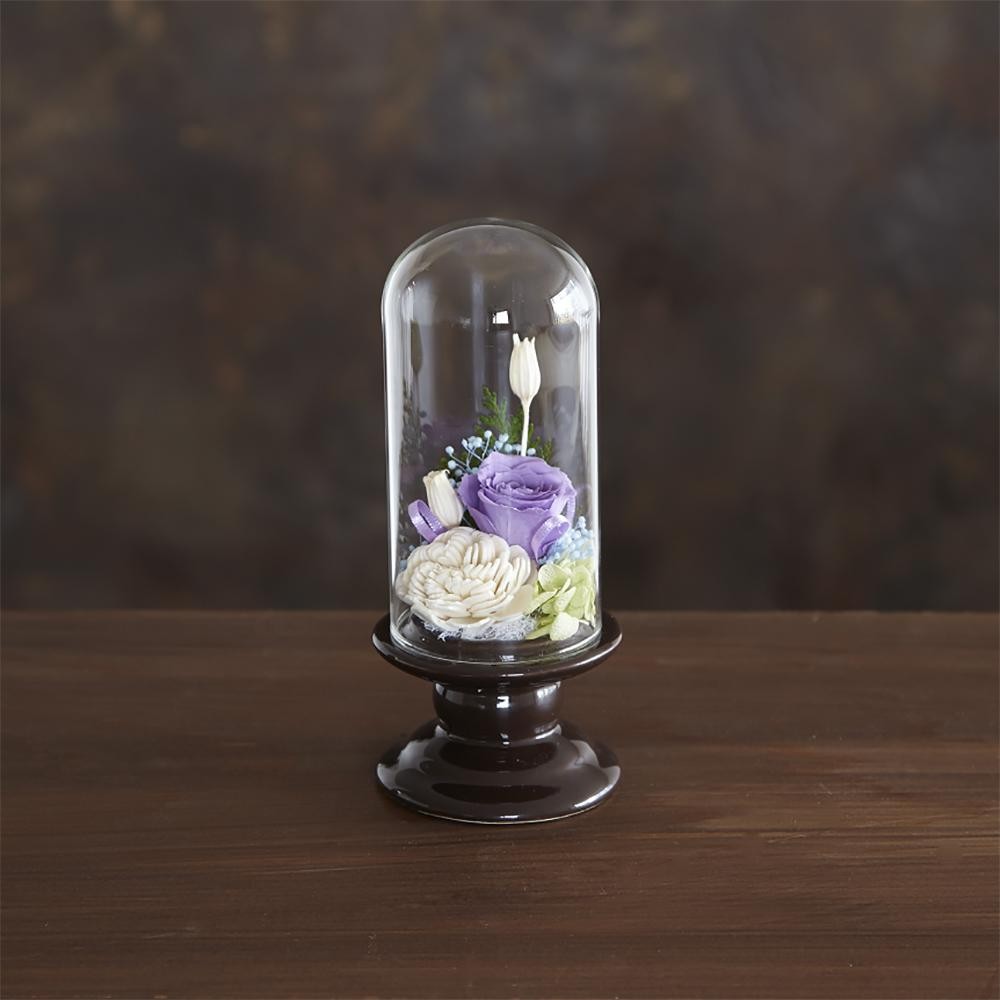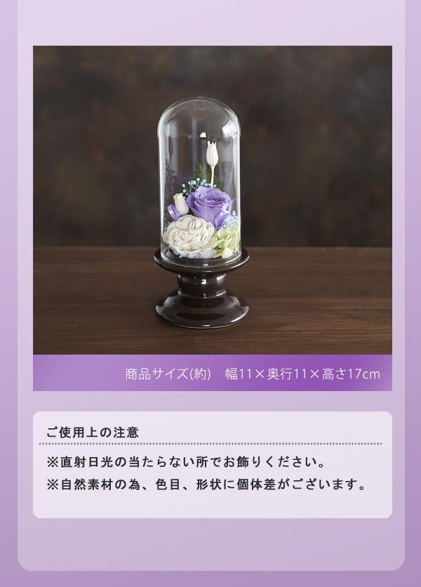 スマートサイズでお仏壇にもぴったり。お盆、お彼岸のお供えとしてもおすすめです。プリザーブドフラワーなので、水換え不要!!ガラスドームにお花が入っているので、埃がつきにくく長持ちします。 |