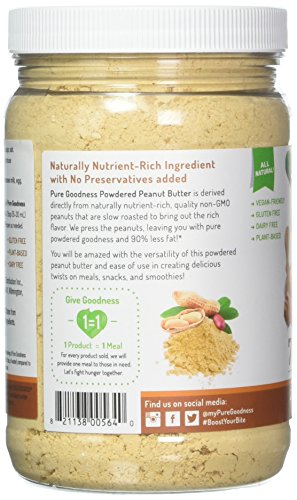 Pure Goodness Powdered Peanut Butter is derived directly from the naturally nutrient-rich, quality peanuts that are slow roasted to bring out the rich flavours. We press the peanuts, leaving you with pure powdered goodness and removing 90% of the fat! Mix 1 Part water and 1 part Powdered Deliciousness! You will be amazed with the versatility of this powdered peanut butter and ease of use in creating delicious twists on meals, snacks and smoothies! Plus, for every product you purchase at Pure Goodness, we provide a meal to a child in need on your behalf. We currently have a goal of providing one million meals in our hopes to fight the war against child hunger! Visit our blog to find delectable sweet and savory recipes using our Powdered Peanut Butter. It is a completely plant-based peanut butter source that is vegan friendly, gluten free, dairy free and soy free! It is a clean, healthy and delicious source of protein for you to power through your day!Feature