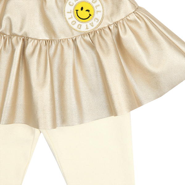 골드 배색 캣돌 치랭스입니다. 은은하게 블링거리는 무광 골드 에코가죽이 고급스러운데요. 캣돌 스마일 와팬으로 포인트를 주었습니다. 겨울철 두툼한 상의나 니트웨어와 코디시 넘 잘어울려요.