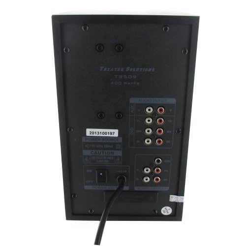 Theater Solutions TS509 5.1 Home Theater Speaker System is a compact, high-definition 5.1 home theater system that's simple to set up and use. The TS509 features a Pro Surround channel switch to integrate all your surround formatted movies, music and games and deliver a true surround experience. The Speaker system consists of five speakers - left, center and right front channels with two rear surrounds - and one powered subwoofer. All five speakers in this home theater are identical, creating a seamless blend of sound and style. Inside each modern, high-gloss black enclosure, you'll find durable, high-quality components that will provide superior performances for years to come. Each speaker is magnetically shielded - so it won't interfere with your TV picture - and can be positioned vertically or horizontally next to your HDTV or other type of flat-panel. This home theater system's subwoofer delivers class-leading, room-shaking bass thanks to a powerful digital hybrid subwoofer amplifier and a 5.25-inch driver. Featuring a sleek black high-gloss finish, this hard-hitter also includes an at your fingertips remote, so you can customize the level of bass for your room and independently control the front, rear, and center channel speaker. Sound accounts for half of the home theater experience, whether you're watching a movie or sporting event - or even playing a video game. Your TV is only one piece of the puzzle. It's the audio that drives the action, creates the mood and brings your video content to life. So, make the TS509 part of your home entertainment today.Feature