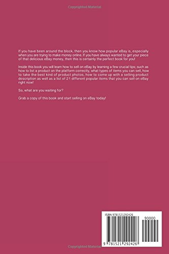 Inside this book you will learn how to sell on eBay by learning a few crucial tips; such as how to list a product on the platform correctly, what types of items you can sell, how to take the best kind of product photos, how to come up with a selling product description as well as a list of 21 different popular items that you can sell on eBay right now!