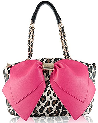 -. Binding : Apparel -. Brand : Betsey Johnson -. Color : Leopard Print -. Department : womens -. EAN : 0889487095958 -. Feature : FREE UPGRADE TO 2-3 DAY PRIORITY MAIL TO ANY U.S. ADDRESS / FREE UPGRADE TO 2-3 DAY PRIORITY MAIL TO ANY U.S. ADDRESS Brand New Factory Fresh Packaged With Original Manufacturers Tags / All Items Come From A Smoke Free Environment / FREE UPGRADE TO 2-3 DAY PRIORITY MAIL TO ANY U.S. ADDRESS 100% Authenticity Guaranteed / FREE UPGRADE TO 2-3 DAY PRIORITY MAIL TO ANY U.S. ADDRESS Bow-nanza Pebbled Satchel Bag, Leopard/Fuschia • Pebbled PVC satchel bag with golden hardware. • Chain link and black pebbled satchel handles; 9" drop. • Front features extra large bow with golden spiked signature "knot;" signature lozenge on back. • Zip top closure with logo pull tab. • Inside: jewel printed polyurethane lining; key clasp; one zip pocket; two elasticized pockets; one small slip pocket. • 8 1/2"H x 11 1/2"W x 6"D -. Model : BJ55235P LEO/FUS -. MPN : 4331348974 -. PartNumber : 4331348974 -. ProductGroup : Shoes -. ProductTypeName : ACCESSORY -. Title : Betsey Johnson Bj55235p Bownanza Glm Large Fuschia Bow Leopard Satchel Shouder Bag -. UPC : 889487095958