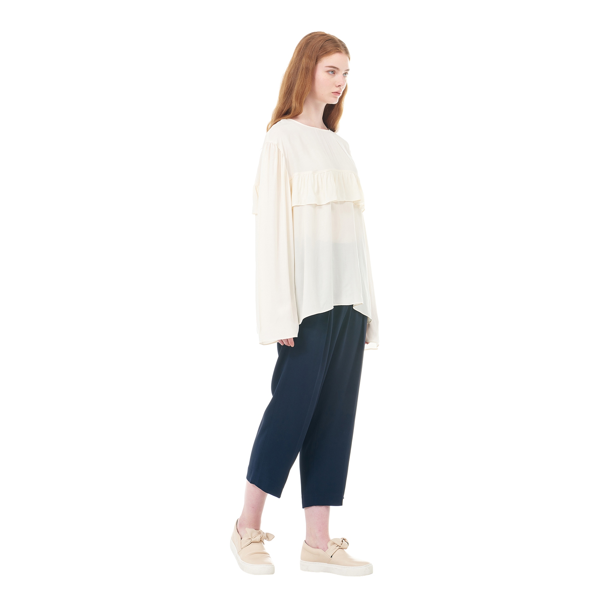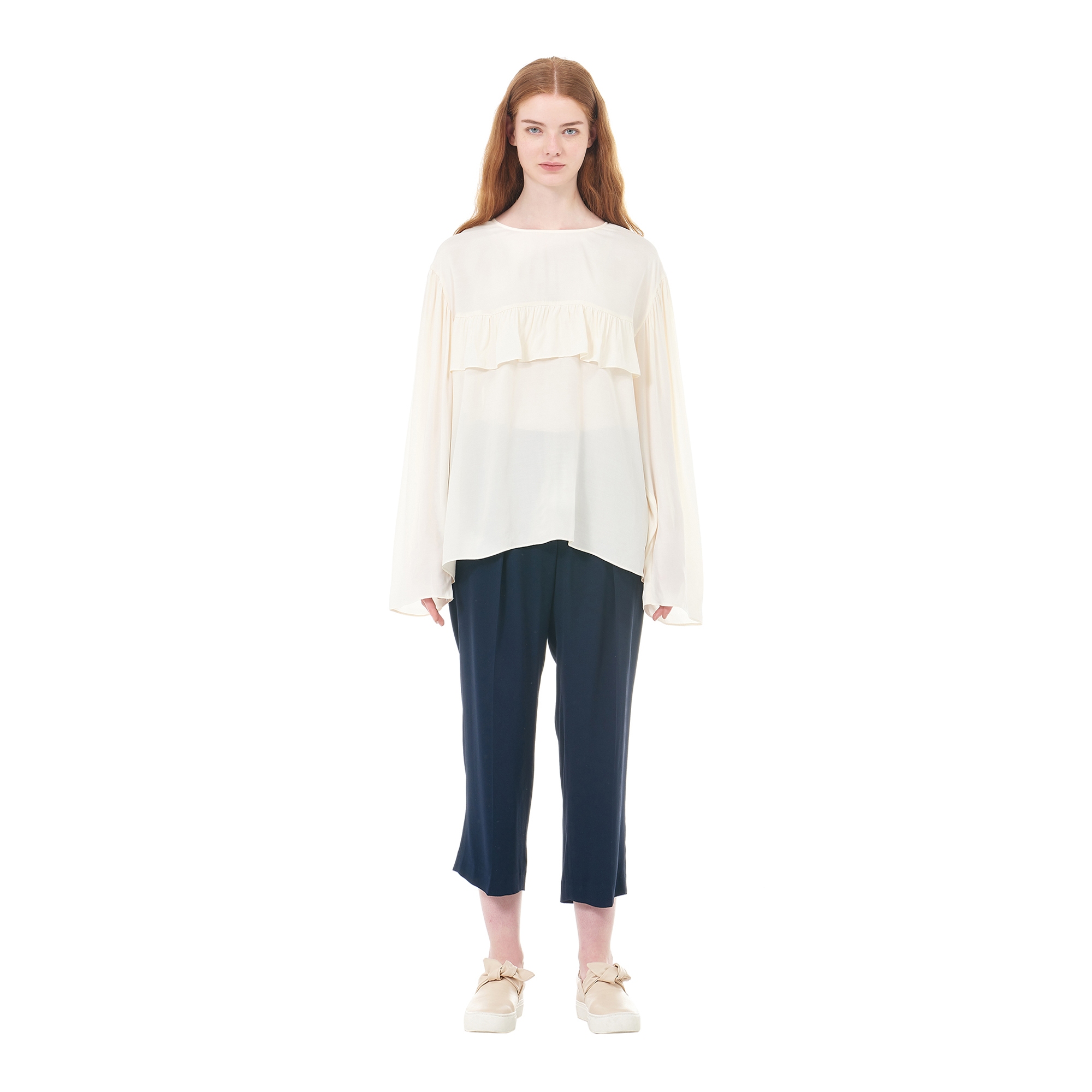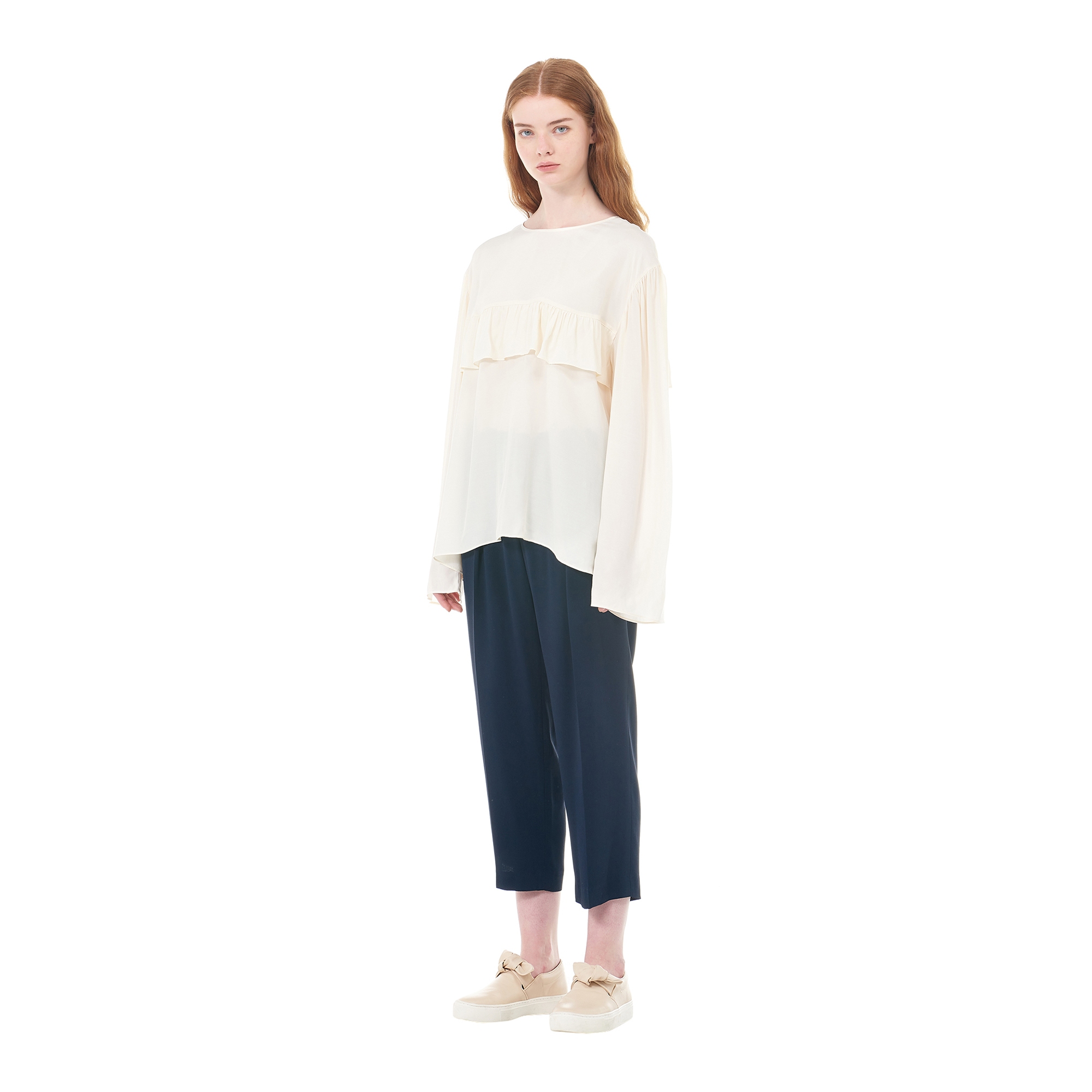 컬렉션 : 2018 Fall/Winter 디자인 포인트 : - 프릴 장식 디테일이 돋보이는 페미닌한 무드의 레이온 블라우스- 라운드넥 디테일과 베이직한 핏을 가진 롱 슬리브 디자인- 레이온 소재로 가벼운 착용감을 자랑하는 포인트 아이템 스타일링 추천 : 다양한 워싱의 스키니진 혹은 부츠컷 팬츠와 트렌디한 스타일링을 할 수 있음