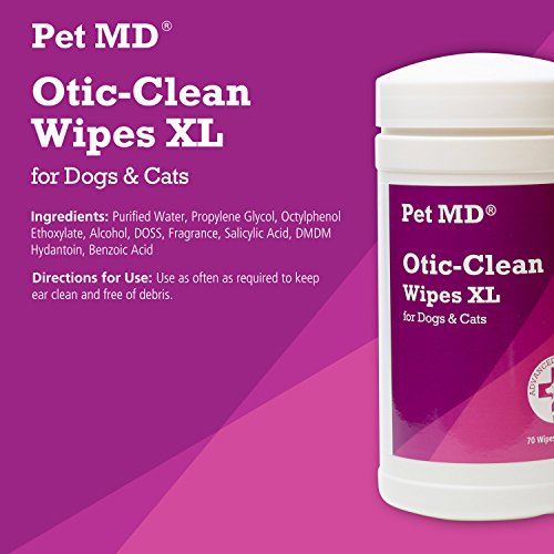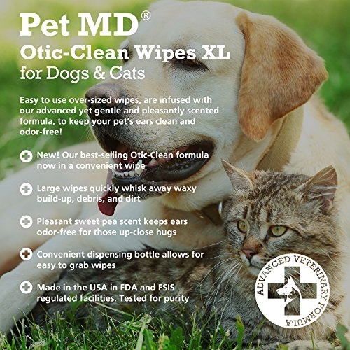 -. Binding : Misc. -. Brand : Pet MD -. EAN : 0840235149453 -. Feature : ADVANCED VETERINARY FORMULA Made to Clean, Deodorize and Dry Your Pets Ears to Keep them Clear of Infections, Mites and Yeast. / REMOVES DIRT FAST - These Tough but Gentle Cat and Dog Ear Wipes Quickly Whisk Away Dirt, Waxy Build-up and Discharge. Perfect For On The Go Use. / ODOR FREE EARS - Pleasant Sweet Pea & Vanilla Scented Wipes Keep Ears Clean and Odor-Free For Those Up-Close Hugs. / EASY TO USE - Get More Coverage From Each XL Wipe. Convenient Dispensing Bottle Makes it Easy to Grab These Extra Large (5 inch by 6 inch) Wipes. / Made In The USA In Federally Regulated Manufacturing Facilities to Ensure Quality and Safety. -. Label : Pet MD -. Manufacturer : Pet MD -. PackageQuantity : 1 -. ProductGroup : Pet Products -. ProductTypeName : PET_SUPPLIES -. Publisher : Pet MD -. Studio : Pet MD -. Title : Pet MD Cat and Dog Ear Wipes Otic Clean Ear Cleaner Wipes for Pets - 70 XL Wipes -. UPC : 840235149453