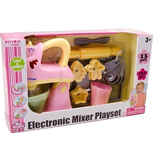 -. Feature : 13 piece set includes Electronic Mixer, Tray, Measuring cup, Spatula / 3 Cookie Molds, 5 measuring Spoons and a Rolling Pin / Realistic Mixing Sounds and Lights / Batteries Required (2 x AA (1.5V) (Included in Box) / Option for Continuous or Pulse or Intermittent Mixing