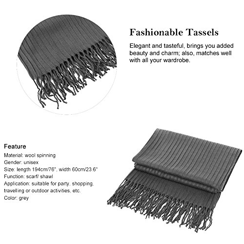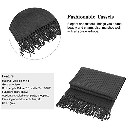 Binding : Apparel Product Description Information Vbiger Double Sided Winter Warm Scarf- Fashionable and beautiful, show yourself and enjoy this winter! With multiple wearing methods, it allows to show your elegance and charm in different ways. Made of wool spinning, this scarf is very soft and comfortable to wear, and realizes well keeping warm property. If you want to know more details or have any questions, please look through the detailed page or contact the customer service. Feature Material: wool spinning Gender: unisex Size: length 194cm/76", width 60cm/23.6" Function: scarf/ shawl Application: suitable for party, shopping, travelling or outdoor activities, etc. Color: grey Package list: 1x scarf Notice * The actual color may vary slightly from the online image due to monitor color settings. * Please allow slight measurement deviation for the data. Package Including -1x scarf 0