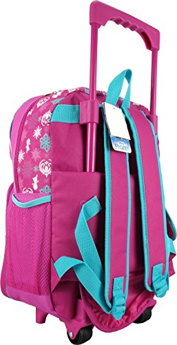 -. Brand : Disney -. Color : pink blue -. EAN : 0875598673406 -. Feature : Rolling backpack, double zippered main compartment / Two Front pockets with zipper closure / One side vecro-closure flap pocket and one side meshed pocket / Adjustable padded shoulder straps / Measures around : 16"H x 12"W x 5"D -. ProductGroup : Apparel -. ProductTypeName : LAGE -. Title : Disney Frozen 16" Large Rolling Backpack -. UPC : 875598673406