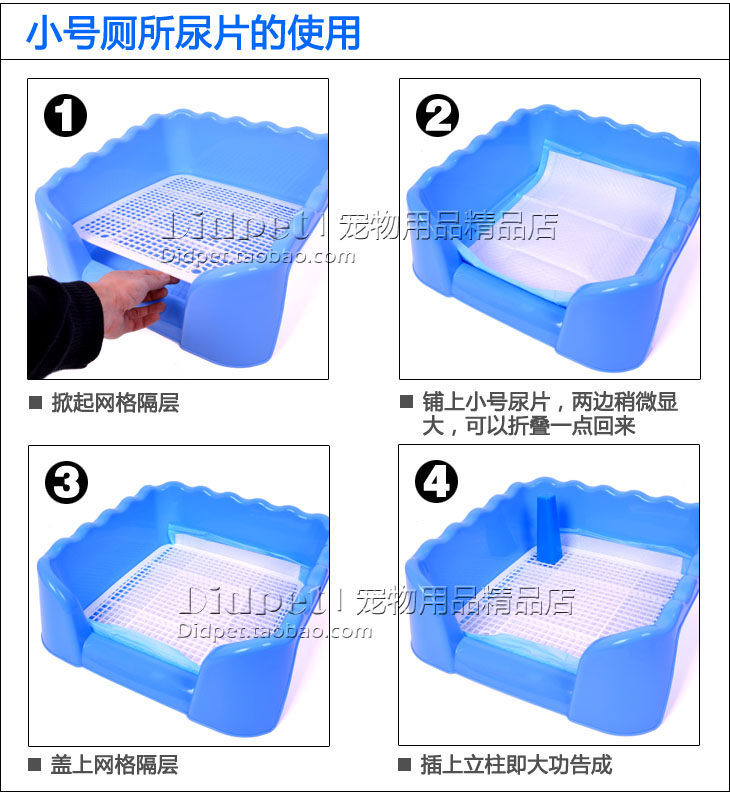 底部结构采用筛网状面板和盒状底板组合而成,便于分开清洁。可以让狗狗直接在厕所上方便,尿液会从筛状网格上渗下,不会弄脏弄湿狗狗的腿毛。