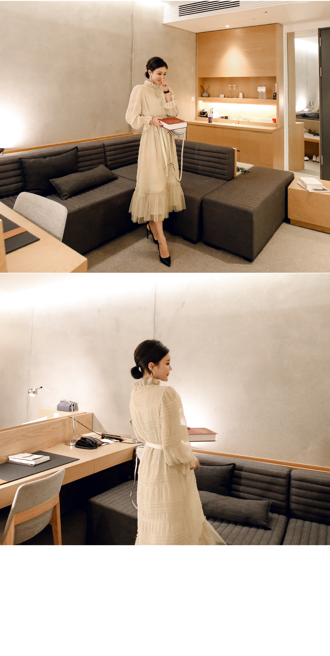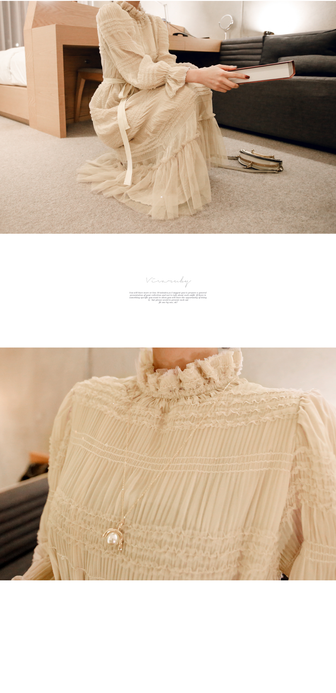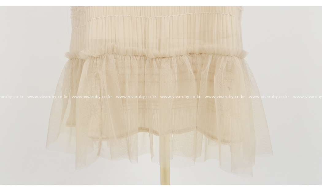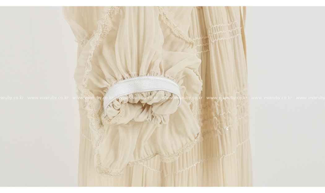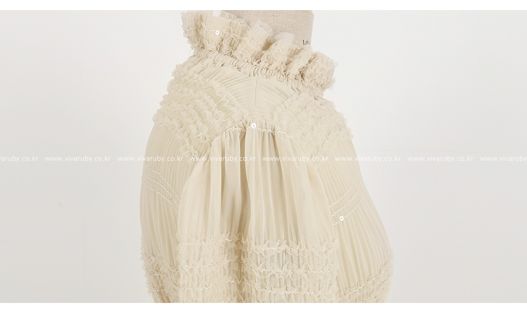 ネックラインと袖のフリルディテールに