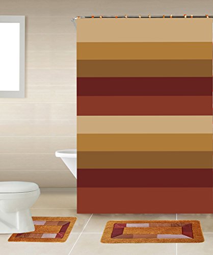 -. Title : Sylvia Burgundy Multi-Tone Striped 15-Piece Bathroom Accessory Set: 2 Bath Mats, Shower Curtain & 12 Fabric Covered Rings