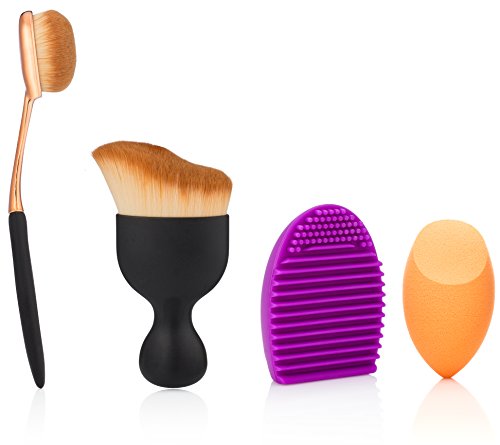 The makeup set includes 4 items: Oval foundation brush, make up brush cleaning board, LATEX-FRE makeup pro blending sponge , S-Shaped Curved brush