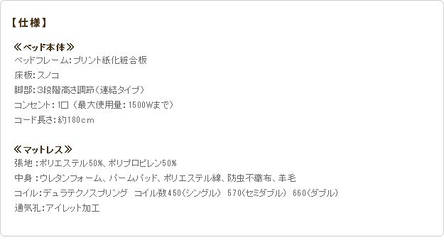材質:[ベッド]本体-プリント紙化粧合板、床板-スノコ床板、コンセント-1口(1500W)、[マットレス]側地-ポリエステル50%・ポリプロピレン50%、中身-ウレタンフォーム・パームパッド・ポリエステル綿・防虫不織布・羊毛、コイル-デュラテクノスプリング・コイル数660、通気孔-アイレット加工