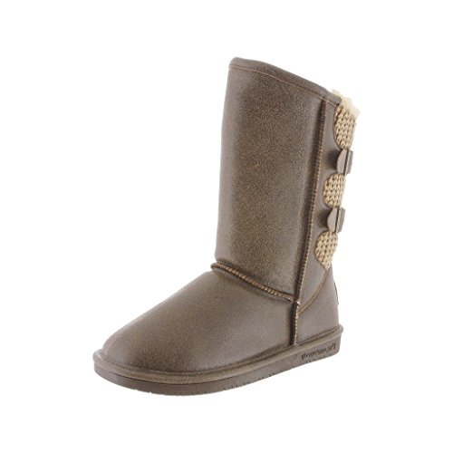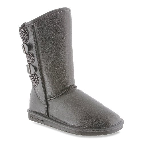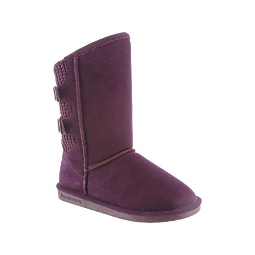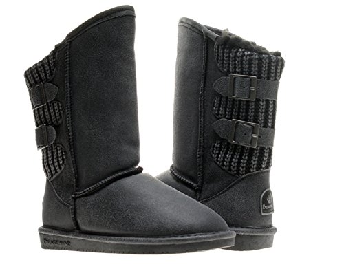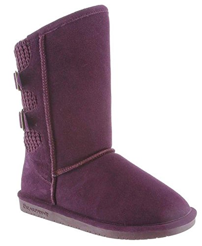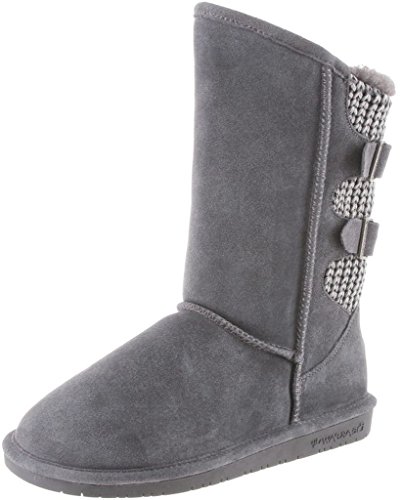 The Boshie is the perfect combination of knit and suede. The suede upper extends up the front of the shaft, with the knit down the back, and attractive branded BEARPAW buckles add some extra flair. The height of the boot is approximately 9'' in the back, 10'' in the front, measured from the base of the sole. Ten inches tall. Pressed suede upper. Knit back detail with BEARPAW branded buckles. Wool blend lining. Sheepskin footbed. Leather heel logo. Classic low profile TPR outsole. Material: Sheepskin.Feature