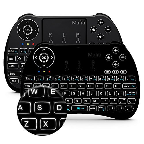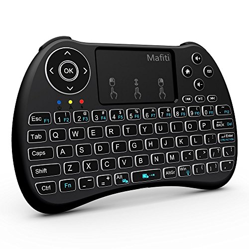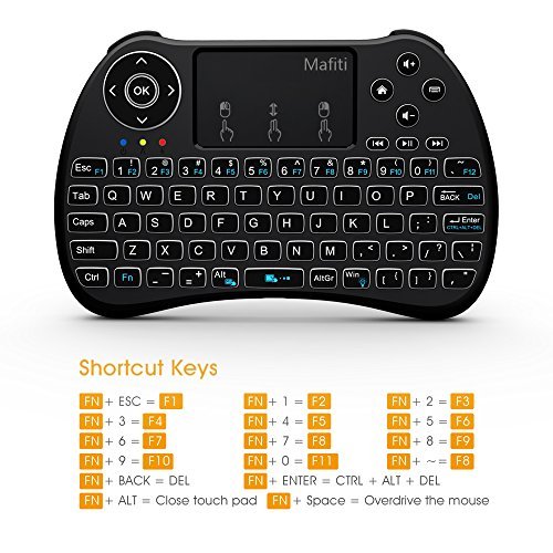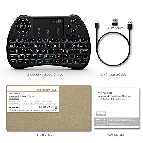 -. Feature : 3 in 1 MultiFunction 2.4GHz Mini Wireless QWERTY keyboard+TouchPad + LED backlit( Backlit button on the Win button with Bulb icon) / Perfect combo: 73 keys Wireless QWERTY Keyboard + Touchpad / Multi-finger Touchpad:A single finger click as left mouse function, two-finger click as the right mouse function, double finger drag as the rolling / Innovative shape, protable, elegant, Perfect for PC, Pad, Andriod TV Box, HTPC/IPTV / Package Includes: 1x Wireless keyboard, 1x Wireless receiver, 1x Charge cable, 1x User manual