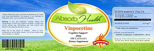 -. Binding : Health and Beauty -. Brand : Absorb Health -. EAN : 0755563358364 -. Feature : * Vinpocetine Increases Cerebral Blood Flow / * Shown to Improve Memory and Mood / * Free U.S. Domestic Shipping On Orders Over $25, Money Back Guarantee, One Day Handling / * Use Coupons to Save on Our Other Products / * Manufactured in GMP-Compliant Facilities -. IsAdultProduct : 0 -. Label : Absorb Health -. Manufacturer : Absorb Health -. ProductGroup : Health and Beauty -. ProductTypeName : HEALTH_PERSONAL_CARE -. Publisher : Absorb Health -. Studio : Absorb Health -. Title : Vinpocetine | 10mg 100 Capsules | Improve Cerebral Blood Flow and Cognition | Nootropic Supplement -. UPC : 755563358364
