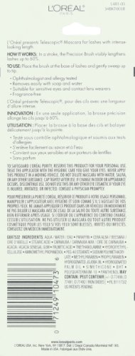L’Oral Paris presents Telescopic Original Mascara enhances your lashes with intense length and unique lash by lash separation. The flat side of the patented flexible Precision Brush lengthens lashes up to 60%, while the comb side of the brush precisely separates lashes for a clump-free result. Fragrance-free. Ophthalmologist-tested and allergy-tested. Suitable for sensitive eyes and contact lens wearers. • Intense length • Up to 60 percent longer lashes • Flexible Precision Brush • Place the brush at the base of lashes and gently sweep up to tip. To safeguard L'Oreal purity, reserve this product for your personal use. Treat the applicator with the hygienic care you give your eyes. Never apply this product in a moving vehicle. Do not dilute mascara with water, saliva, or any other substance. Cap tightly after use. If change in odor or appearance occurs, discontinue use. Do not use this or any other eye cosmetic if your eye is injured, irritated, or infected. Consult a physician promptly.Feature